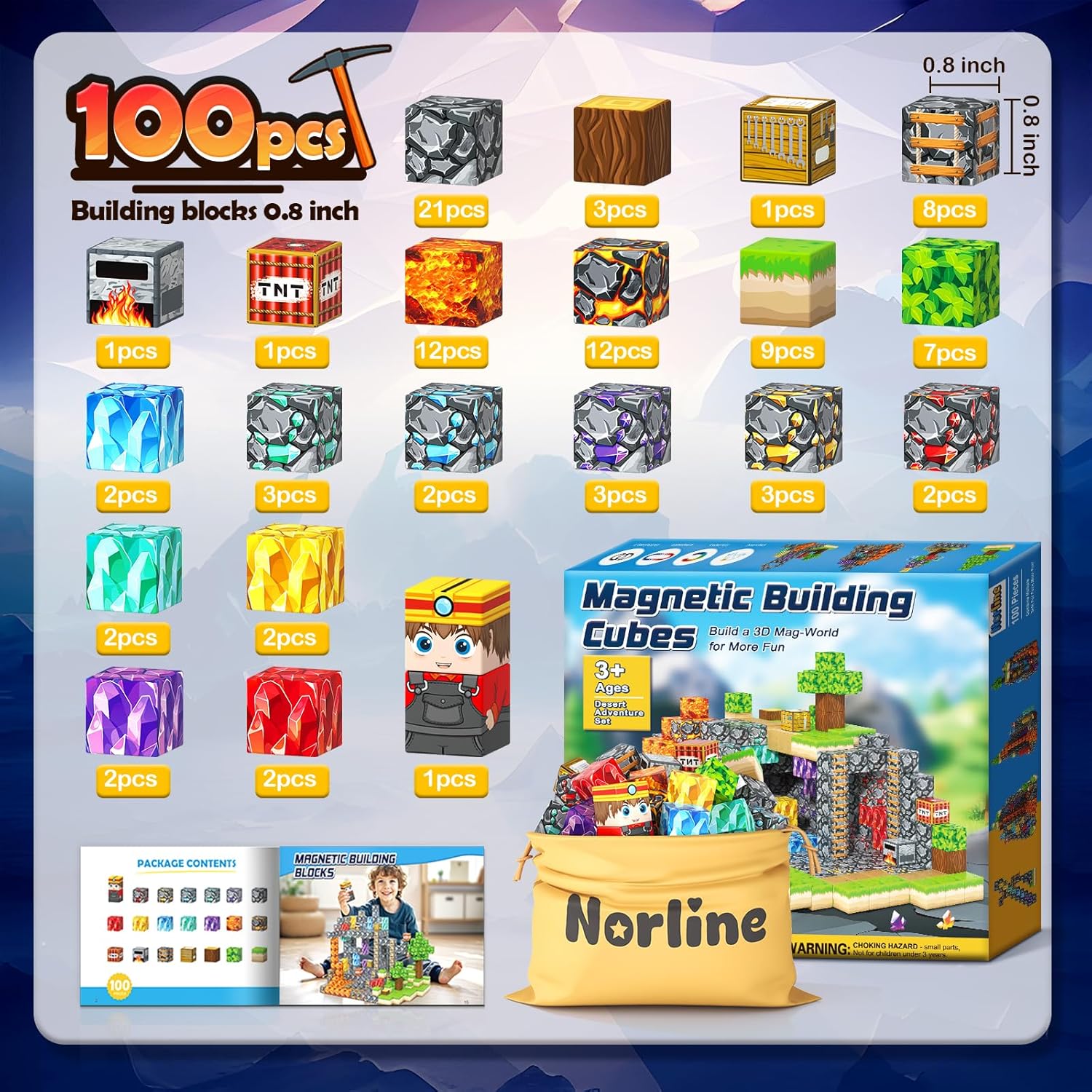 The Norline 100PCS Magnetic Blocks Set is a thrilling "Gem Cave Adventure" playset designed for young gamers. Fully compatible with mainstream 1-inch magnetic cubes, this kit allows kids to expand their existing worlds or start a new exploration map. It brings the fun of video games into the real world, encouraging hands-on creativity.